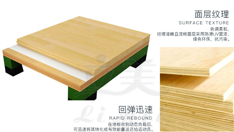 羽毛球管用木地板是一种具有优良的承载性能,高吸震性能,抗变形性能的运动木地板系统,并且其表面的摩擦系数必须达到0.4-0.7,太滑或太涩都会对运动员造成伤害。优良的冲击吸收性能可有效的避免运动员受到运动损伤。作为篮球场的体育木地板,还需要具有90%以上的球体反弹能力。