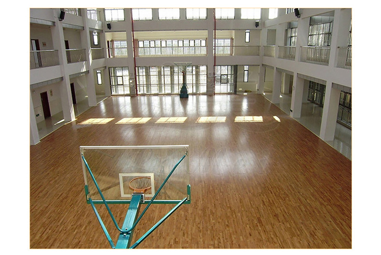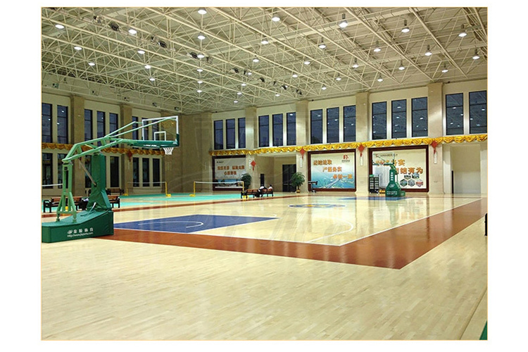 体育馆运动木地板由面板、毛板、龙骨、弹性垫层等构成,其结构复杂。根据性能要求可分为悬浮试、固定试、固定悬浮试。其中固定悬浮试是运动地板发展趋势。一个标准运动木地板,它的系统性能是必须要符合德国性能测试标准。作为实木地板的运动地板还具有特有自然美感,声音坚实温和,色泽柔和,纹路紧密,其表面组织的细微凹凸,使光线散射,能带给运动员更舒适的视觉感。同时,对于篮球、排球这类场地,其天然浅色与色泽鲜艳的漆面能形成更鲜明和谐的对比。