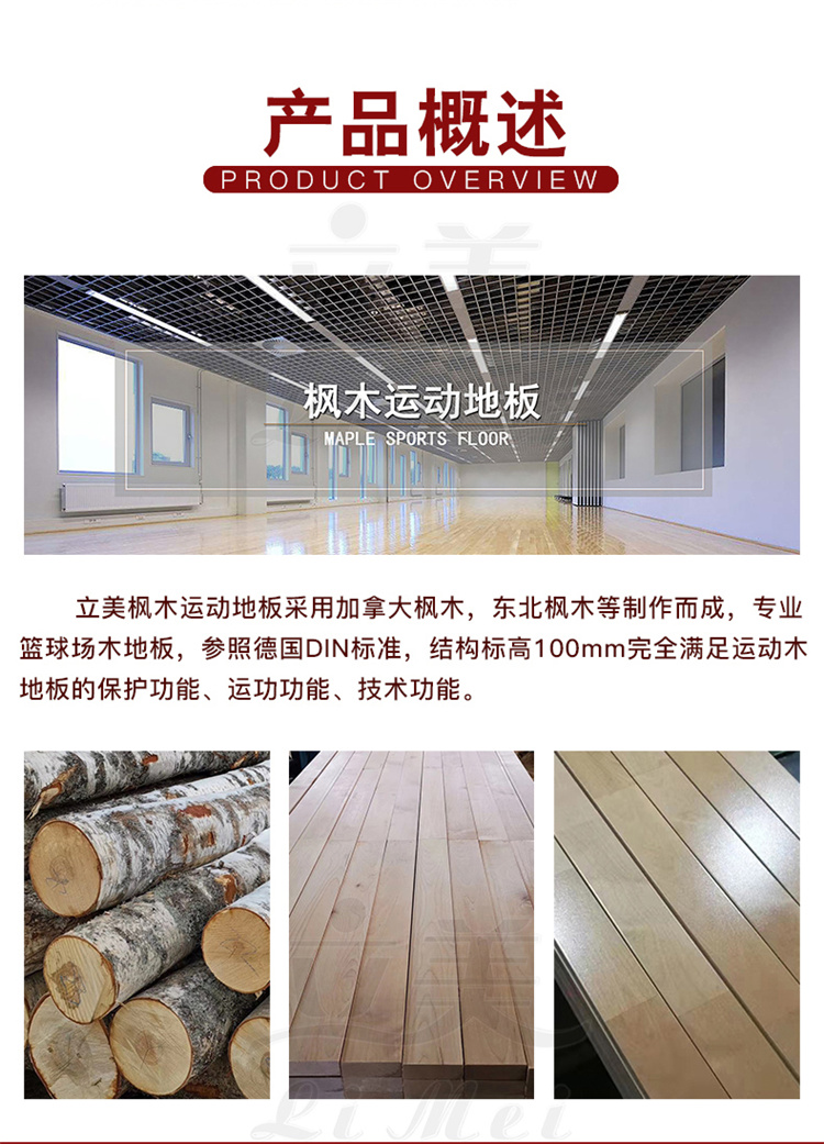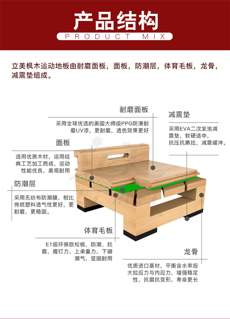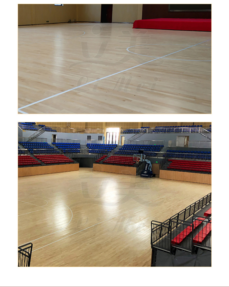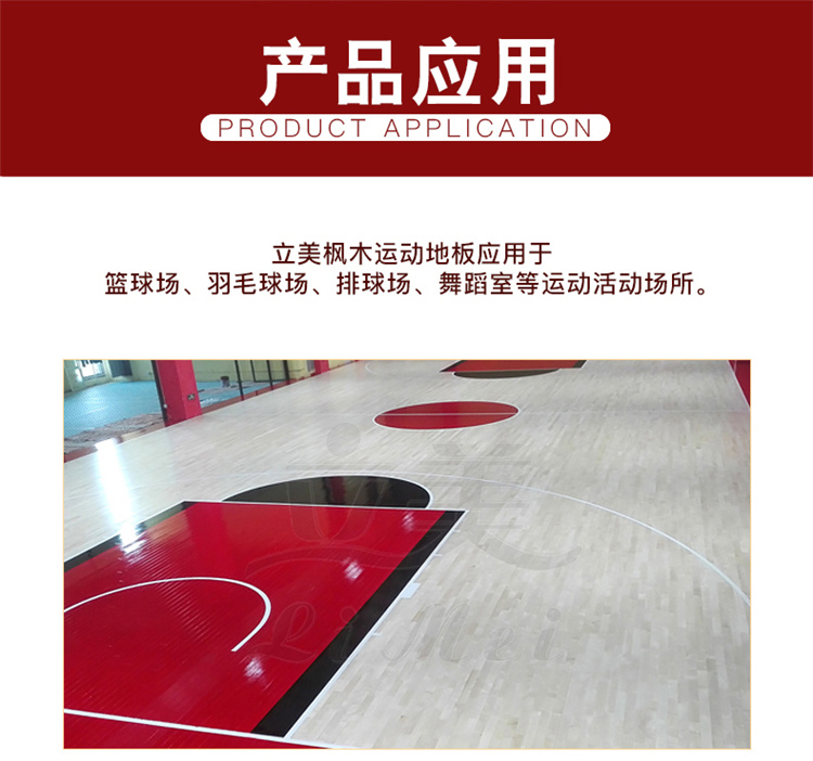 由于枫木是长纤维树种,坚韧性好,硬度也适中,且在比赛以及电视转播中的观看效果良好,因此世界上绝大多数体育馆的面板均是采用枫木来制作。面板含水率不得超过当地平衡含水8%-15%率。