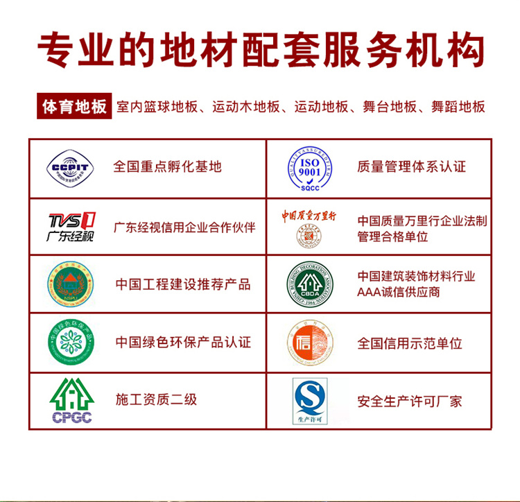 油漆:油漆分为工厂涂装的UV漆和施工现场涂刷的聚胺酯漆两种,一般大多数均采用现场油漆,达到良好效果,体育场油漆防滑,均需满足摩擦系数0.4-0.7的要求。