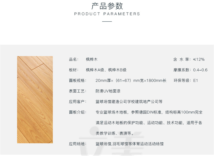 枫桦木地板有防火作用,其材质坚硬,木材耐腐、耐磨,即使在干湿变化较大的情况下不易发生翘裂。质轻而强,缓和冲击,枫桦与人体的冲击、抗力都比其他建筑材料柔和、自然,有益于人体的健康,是室内体育场馆地面铺装的材料。